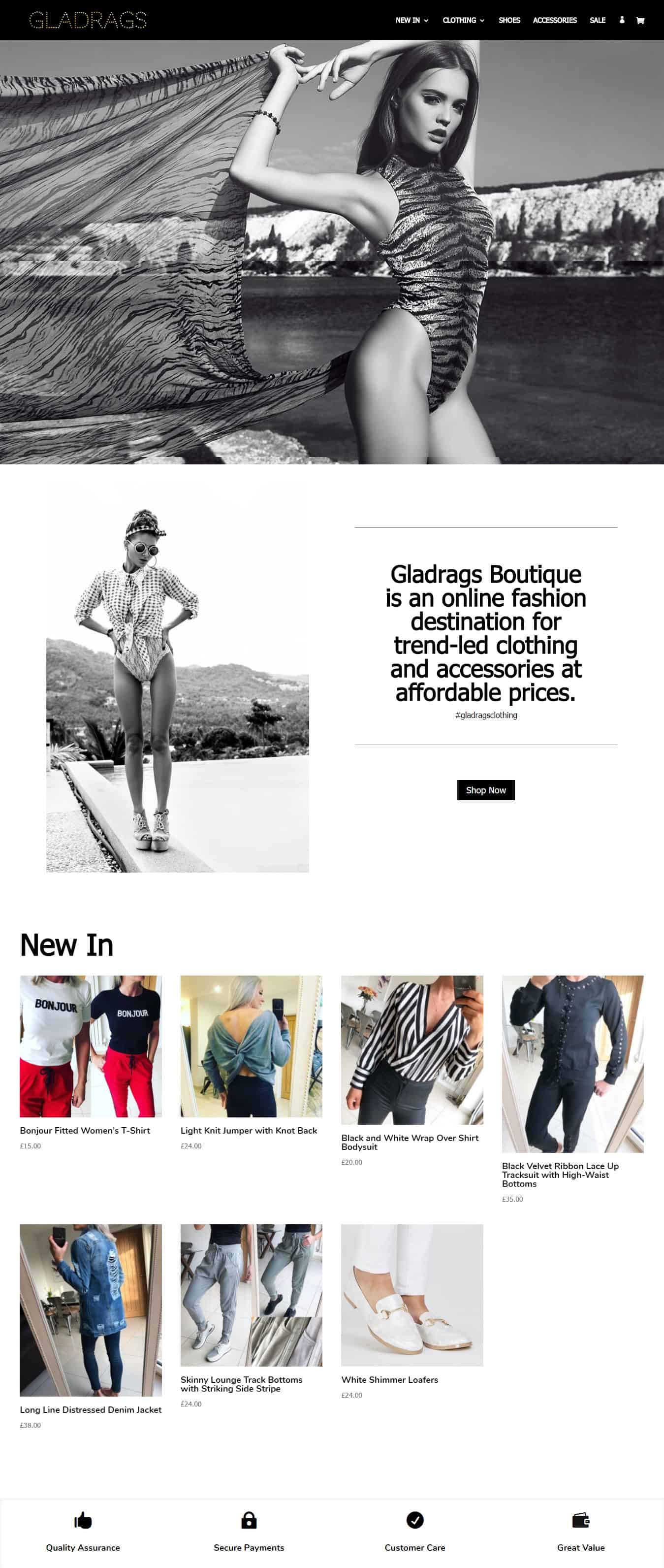 Gladrags Clothing had been using Facebook very successfully as a platform to conduct business but they required a website and ecommerce shop so that their customers could have access to all the information about their products, sizes and stock position. They came to us with the vision of something more, and we provided it. A largely traditional feeling, modern site that uses dark colours effectively to create a striking presence that catches the viewers attentions. Gladrags has many inspirations, all of which we incorporated into the design.